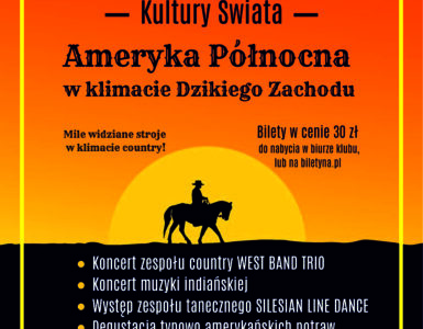 Zapraszamy na wieczór muzyczno – taneczny z cyklu Kultury Świata, tym razem udamy się w niezwykłą podróż po Ameryce Północnej – prosto w klimat Dzikiego Zachodu! Zapraszamy w najbliższą sobote, 25 października...